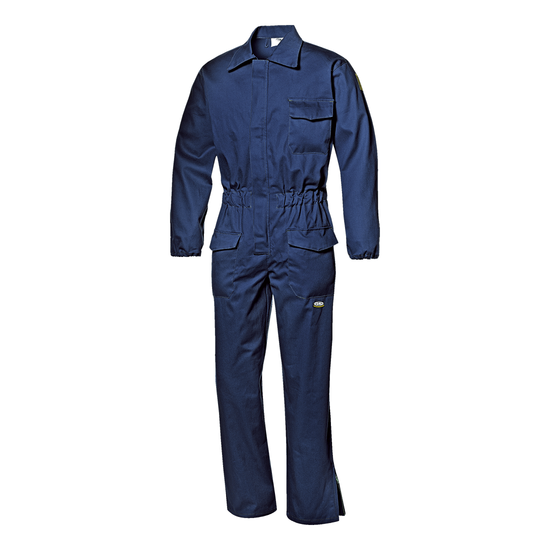 Coverall in 100% Flame Retardant cotton fabric, weight 315 g/m2. Concealed metal zipper closure with Velcro, elastic cuffs, side pockets and chest pocket with flaps and Velcro, elastic waistband, ankle zipper closures.