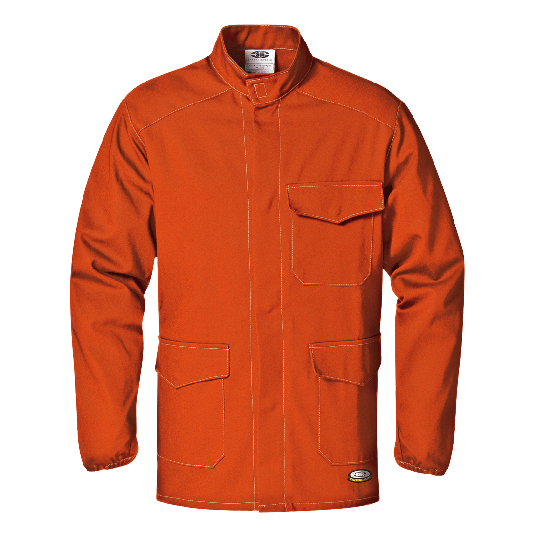 Jacket in 100% Flame Retardant cotton fabric, weight 315 g/m2. It features a chinese collar with Velcro to protect the neck. Concealed front zipper closure with flap and snap buttons; two side pockets and one chest pocket all with flaps and snap buttons, elastic cuffs.