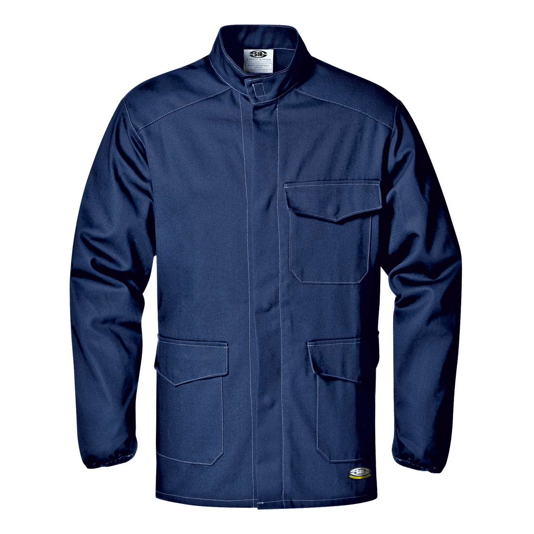 Jacket in 100% Flame Retardant cotton fabric, weight 315 g/m2. It features a chinese collar with Velcro to protect the neck. Concealed front zipper closure with flap and snap buttons; two side pockets and one chest pocket all with flaps and snap buttons, elastic cuffs.