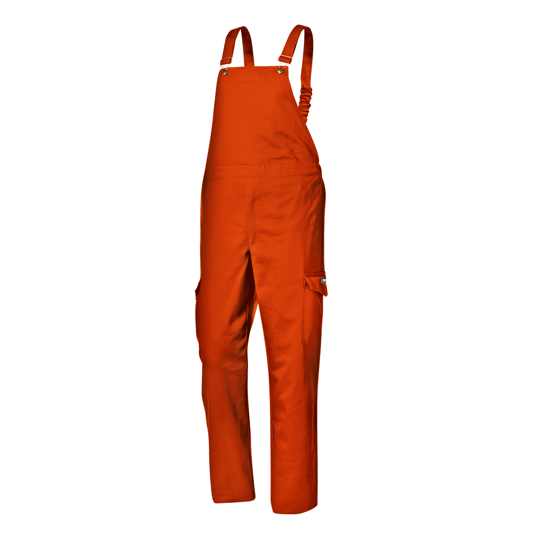 Bib-trousers in 100% Flame Retardant cotton fabric, weight 315 g/m2. It features a concealed metal zipper closure, functional side pockets with flaps and Velcro, one back pocket on the right, rear elastic waistband and metal side buttons, elastic shoulder straps with metal buckles.