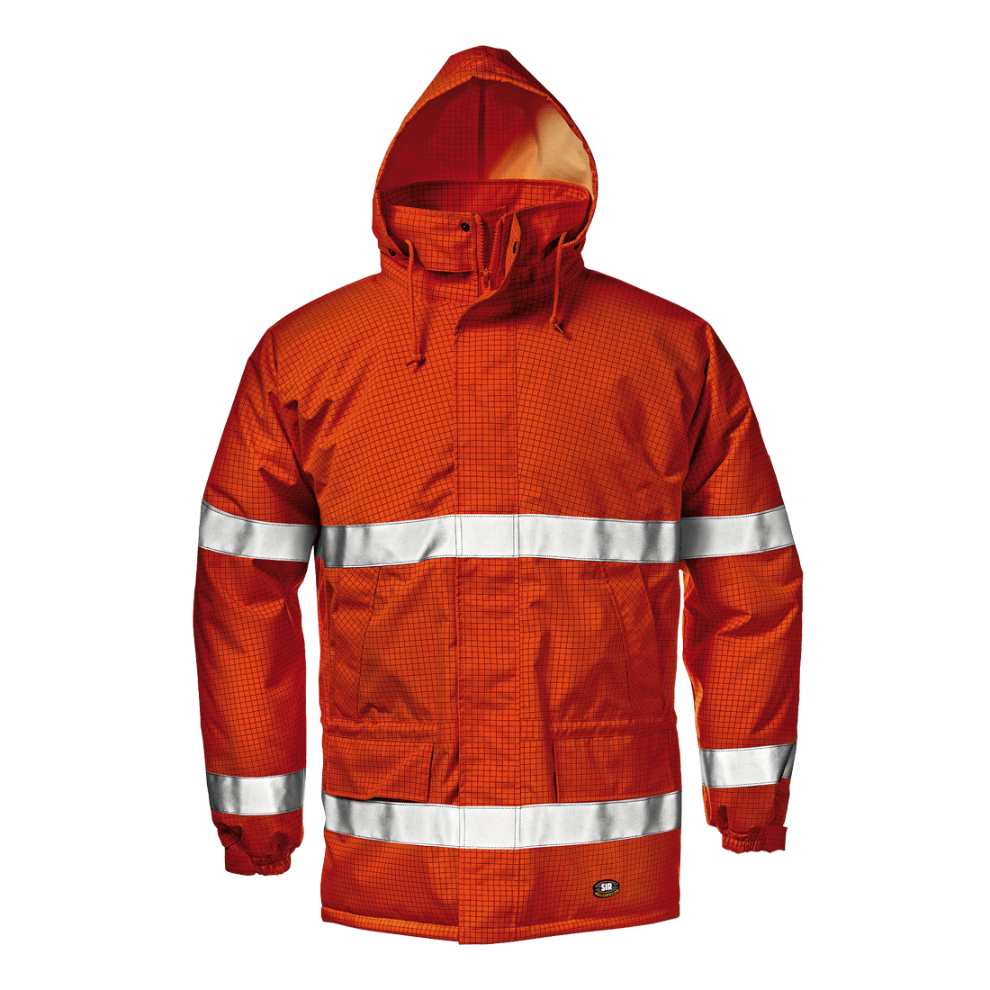 Breathable and waterproof jacket with cold resistant padding, with antistatic, flame retardant and chemical resistant properties. External fabric in 99% polyester and 1% conductive fibre,100% cotton inner lining. With rollaway hood, concealed zipper closure with flap and snap buttons, inner wallet pocket closed with Velcro, two outer muff pockets and two waterproof pockets with flap and Velcro, adjustable elastic cuffs with Velcro, drawstring waistband, reflective band around sleeves, chest and waist.