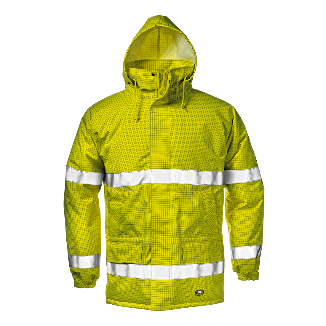 Breathable and waterproof jacket with cold resistant padding, with antistatic, flame retardant and chemical resistant properties. External fabric in 99% polyester and 1% conductive fibre,100% cotton inner lining. With rollaway hood, concealed zipper closure with flap and snap buttons, inner wallet pocket closed with Velcro, two outer muff pockets and two waterproof pockets with flap and Velcro, adjustable elastic cuffs with Velcro, drawstring waistband, reflective band around sleeves, chest and waist.