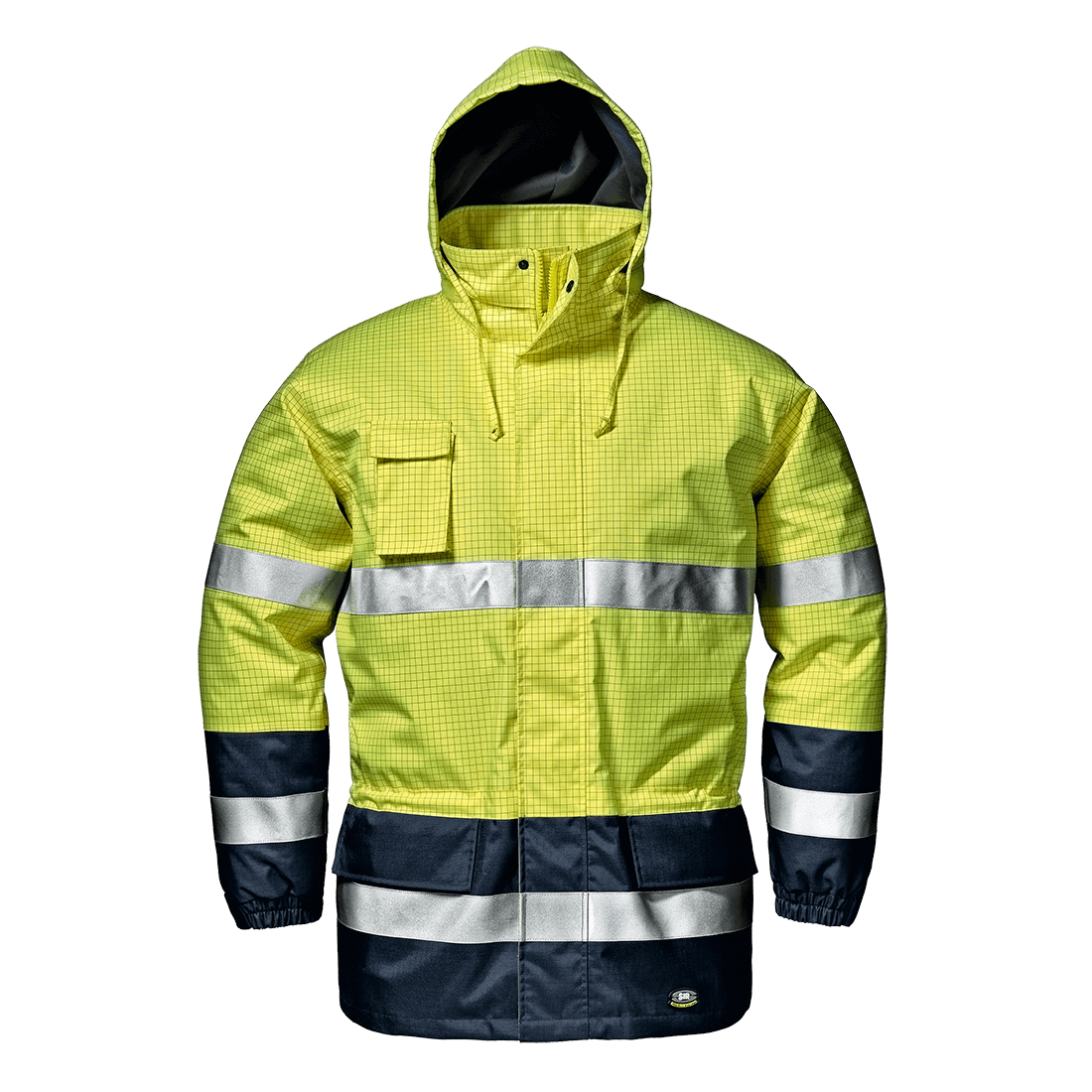 Hi- Vis jacket, realized in 98% polyester and 2% conductive fibre, 100% polyester padding. It features two pockets, one phone pocket on the chest and two wallet inner pockets; With rollaway hood, adjustable elastic cuffs, drawstring waistband and a concealed zipper closure. Inner part detachable with zipper.