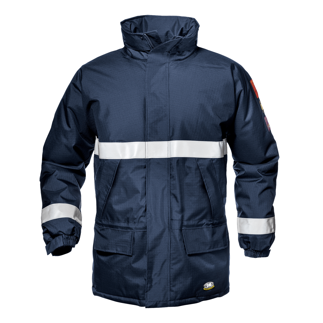 Breathable and waterproof jacket with cold resistant padding, with antistatic, flame retardant and chemical resistant properties. Outer and cold resistant padding in 99% polyester, 1% conductive fibre fabric. With rollaway hood, two-way concealed zipper closure with flap and snap buttons, inner wallet pocket closed with Velcro, two outer muff pockets and two waterproof pockets with flap and Velcro, adjustable elastic cuffs with Velcro, drawstring waistband, reflective band around sleeves and chest.
