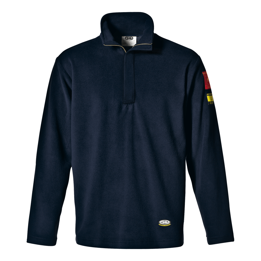 Fleece in 45% modacrylic, 35% cotton, 16% polyester and 4% conductive fibres, weight 250 g/m2, flame resistant and antistatic properties; turtleneck zipper collar.