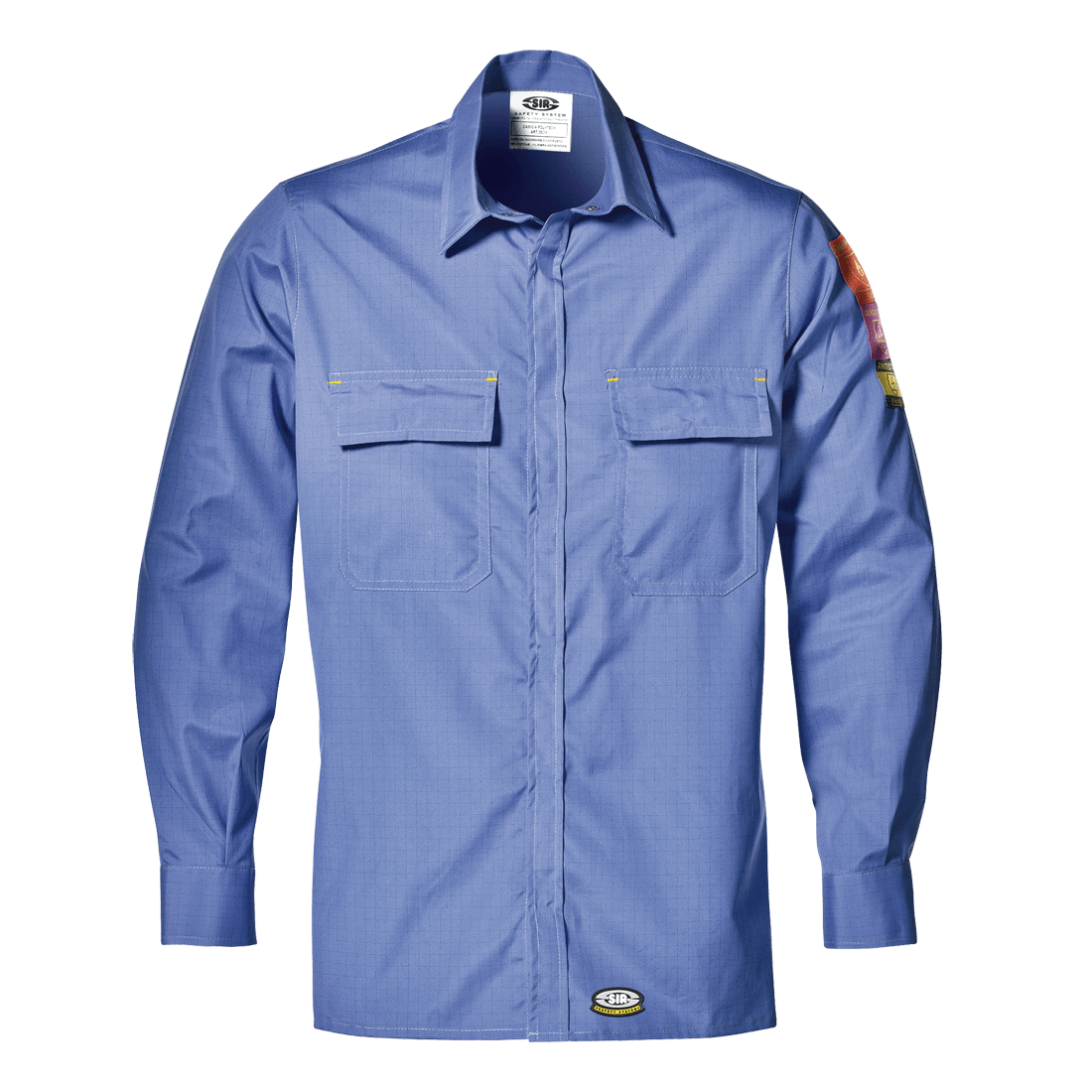 Shirt in 99% cotton and 1% antistatic fibre weight 140 g/m2., with antistatic, fire retardant and acid resistant properties. Snap-buttons concealed central closure, two chest pockets with flaps and concealed snap buttons.