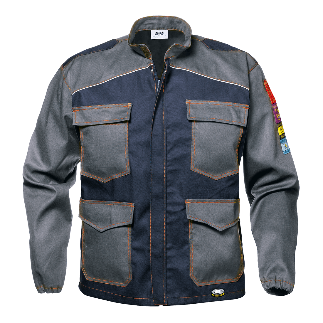 Jacket in 75% cotton, 24% polyester, 1% antistatic fibre fabric, weight 290 g/m2. It features a Chinese collar with Velcro for neck protection, concealed zipper closure with metal snap buttons, two lower pockets and two chest pockets with flaps and Velcro, elastic cuffs, fixed shoulder flaps with military style epaulettes, reflective piping on the chest.