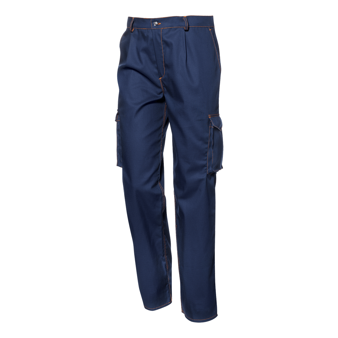 Trousers made of a technical fabric composed by 75% cotton, 24% polyester, 1% antistatic fibre, weight 290 g/m2. It features a fly with zip and button, two front welt pockets, rear pocket with flap and Velcro, two three-dimensional functional pockets with flaps and Velcro on the legs.
