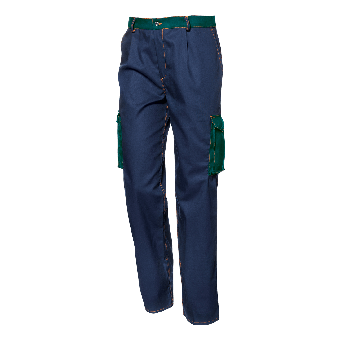 Trousers made of a technical fabric composed by 75% cotton, 24% polyester, 1% antistatic fibre fabric, weight 290 g/m2. It features a fly with zip and button, two front welt pockets, rear pocket with flap and Velcro, two three-dimensional functional pockets with flaps and Velcro on the legs.