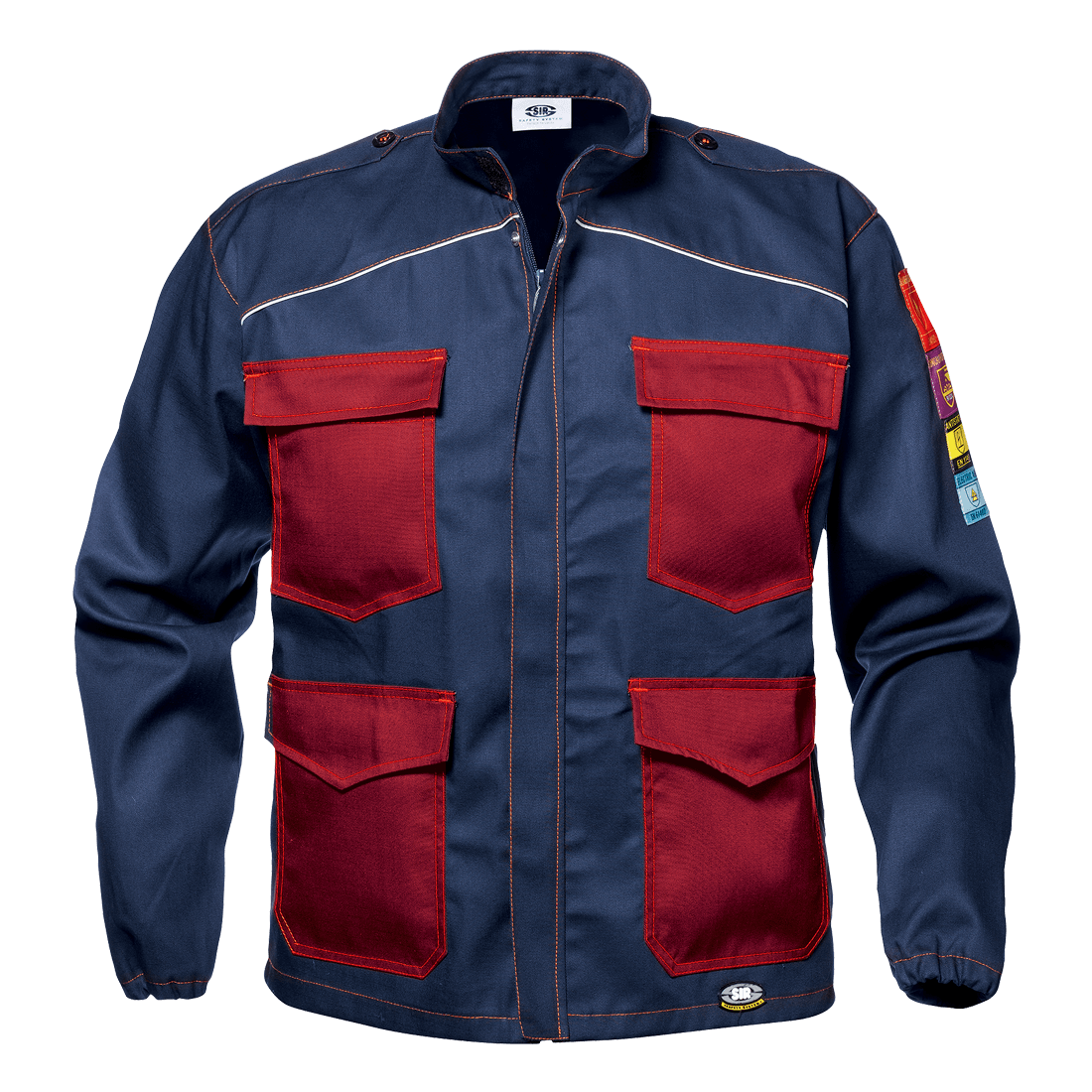 Jacket in 75% cotton, 24% polyester, 1% antistatic fibre fabric, weight 290 g/m2. It features a Chinese collar with Velcro for neck protection, concealed zipper closure with metal snap buttons, two lower pockets and two chest pockets with flaps and Velcro, elastic cuffs, fixed shoulder flaps with military style epaulettes, reflective piping on the chest.