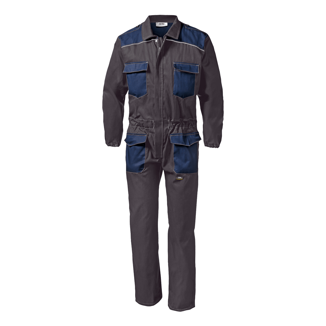 Coverall made of a technical fabric composed by 75% cotton, 24% polyester, 1% antistatic fibre fabric, weight 290 g/m2. With shirt collar, military style epaulettes on the shoulders, concealed two-way zipper closure with snap buttons, two chest pockets and two front pockets all with flaps and Velcro, elastic cuffs, elastic waistband, reflective piping on the chest.