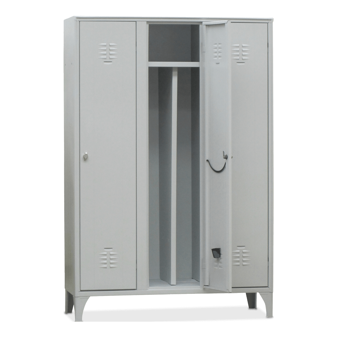 Changing room cabinet with 6/10 thick steel sheet frame, reinforced door and with ventilation slots. Special burglar-proof internal hinges. Shockproof, rounded front perimeter edge. Top shelf, clothes hanger and dirty/clean separator in each compartment and lock with key.