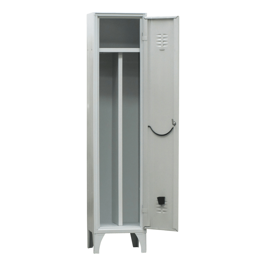 Changing room cabinet with 6/10 thick steel sheet frame, reinforced door and with ventilation slots. Special burglar-proof internal hinges. Shockproof, rounded front perimeter edge. Top shelf, clothes hanger and dirty/clean separator in each compartment and lock with key.