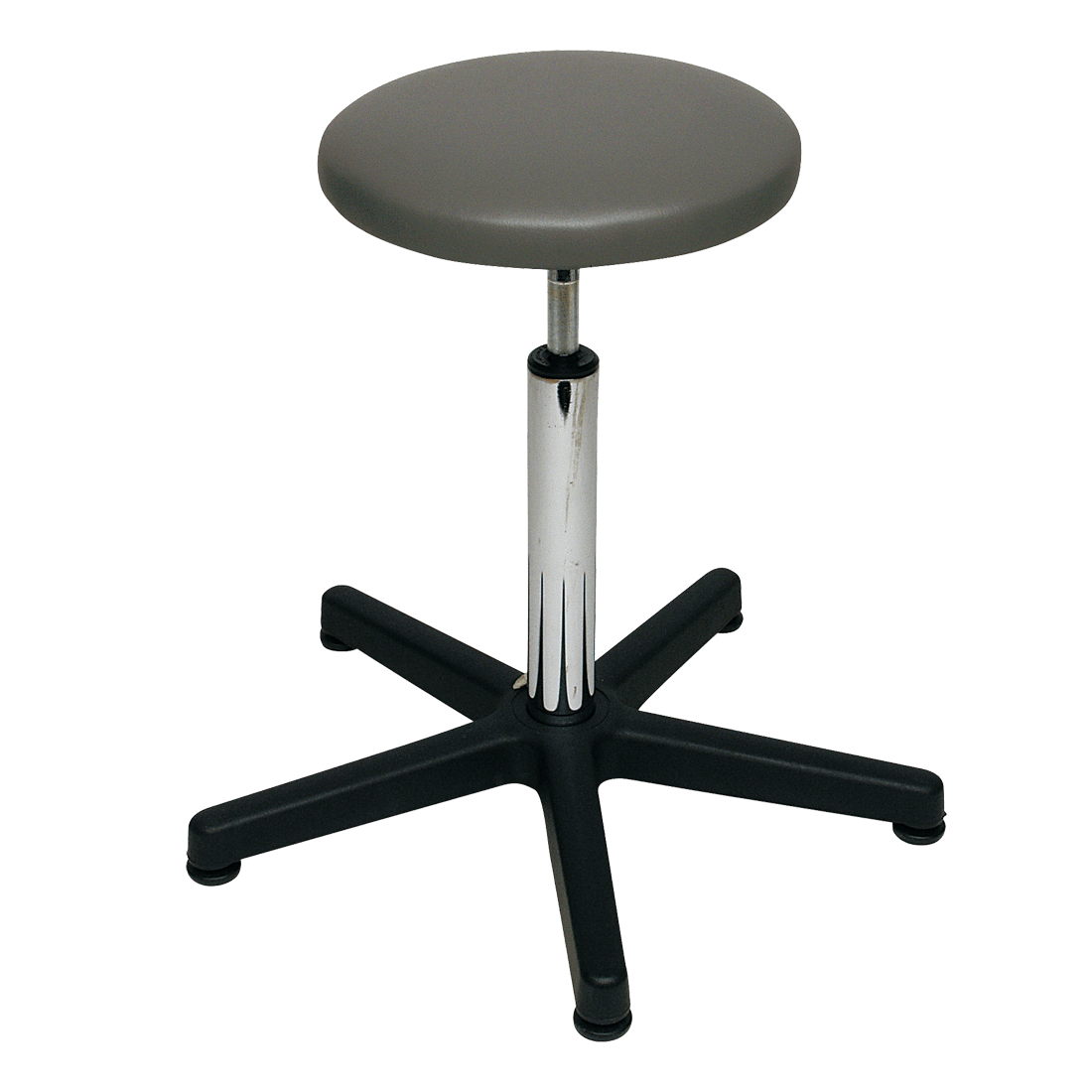 Revolving stool with padded seat, grey colour and 5-spoke plastic base without wheels.