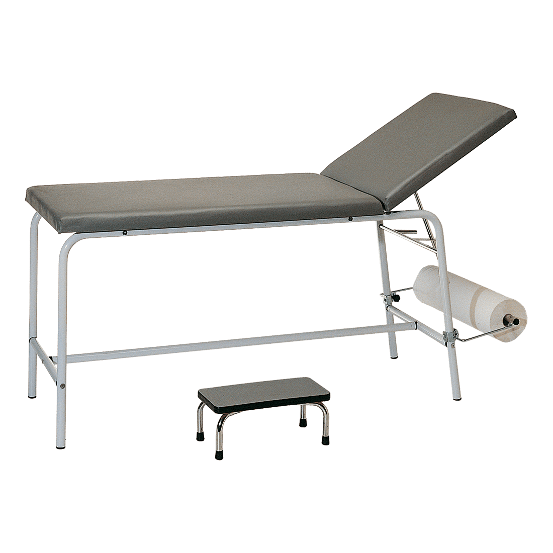 Single-hinged examination bed, in painted metal with raisable and adjustable head rest.