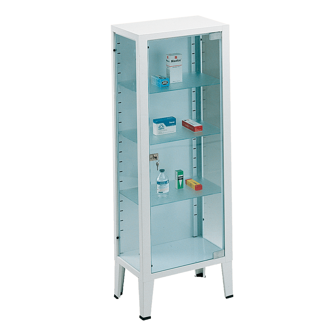 One door enamelled white cabinet, with lock, three-rack mounted adjustable glass shelves.