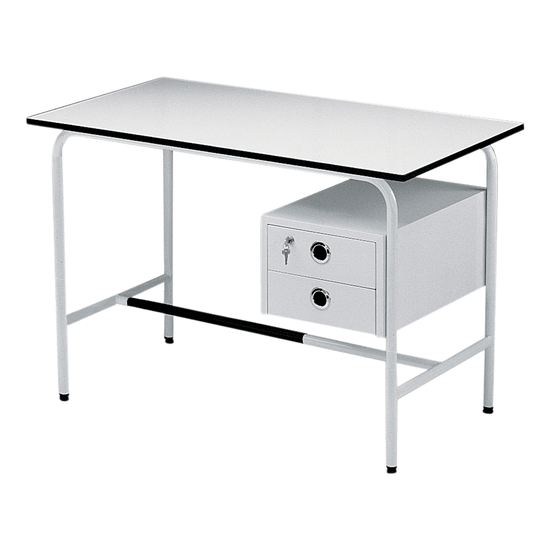 Painted metal desk with acid and abrasion resistant polyester top. Features two lockable drawers.