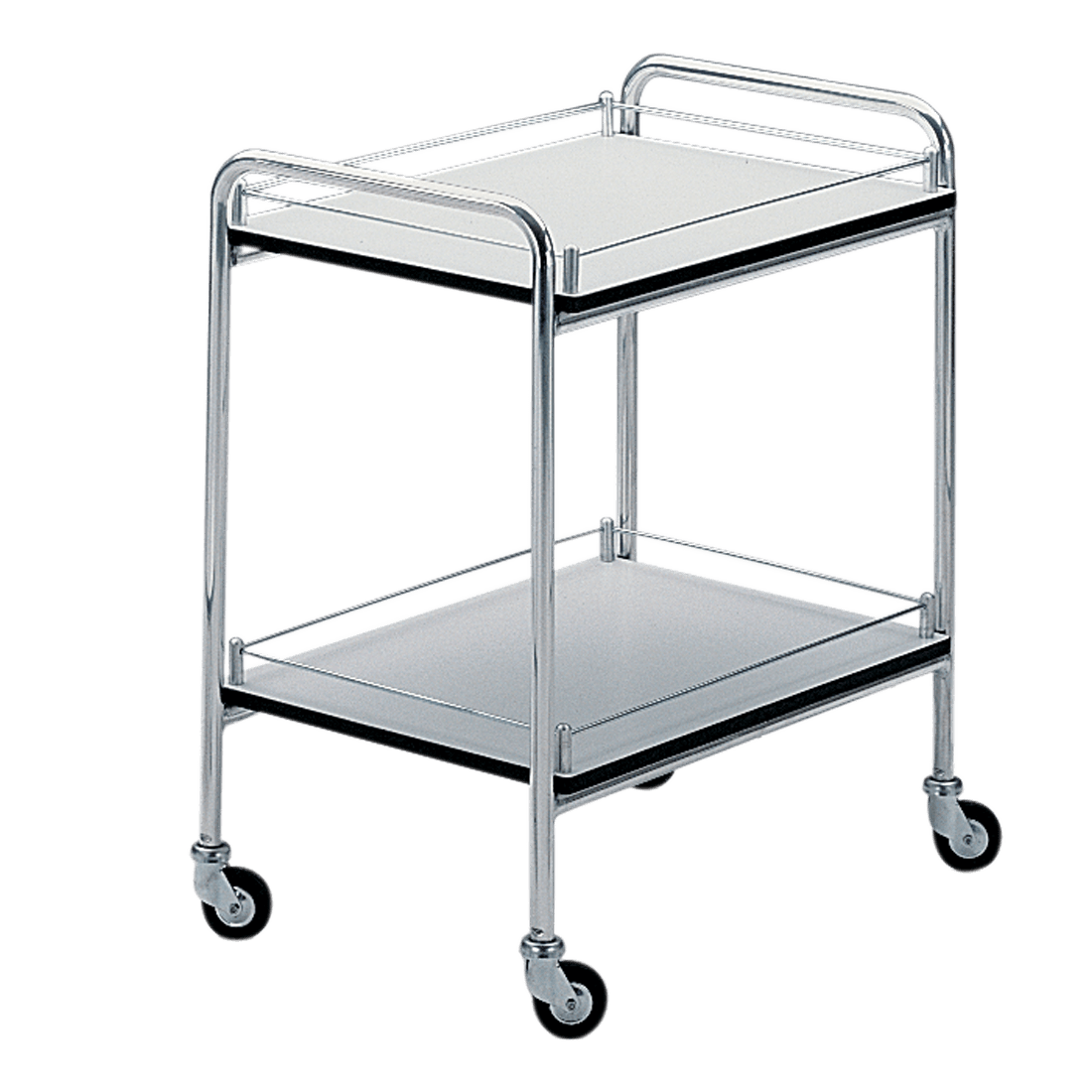 Metal trolley with wheels, featuring two shelves with protective railings.