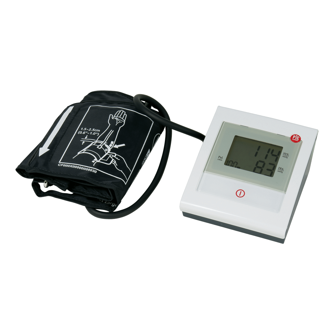 Digital automatic device for blood pressure self testing. Wide monitor, One touch operation, 90 memories with averaging function. Oscillometric method; measurement range: 20-280 mmHg, pulse: 40-180 beats/minute. Accuracy ±3 mmHg - ± 5% (pulse). Automatic power-off after 1 minute’s idle state. Includes 4 AA batteries.