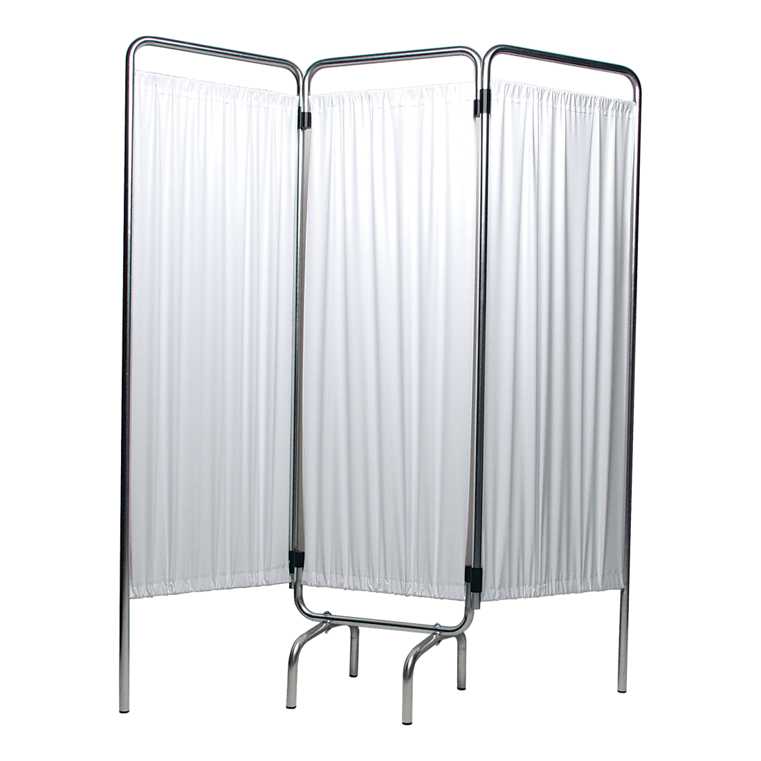 Three-wing screen, aluminium frame, flame resistant washable curtains.