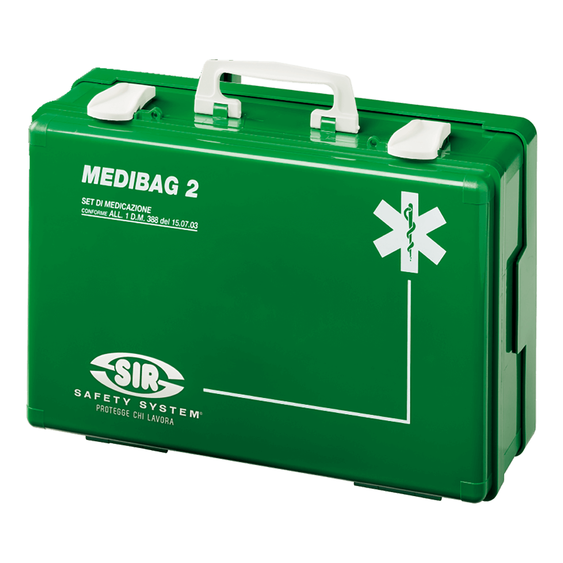 First aid case in impact resistant polypropylene. Equipped with wall attachment plate and handle for easy carrying. Supplied with first aid items required by D.M. 388 15/7/03 attachment 1 and D.L. 81 9/4/08 art. 45. Suitable for working environments with three employees or more. Dimensions: 39.5x13.5x27 cm.