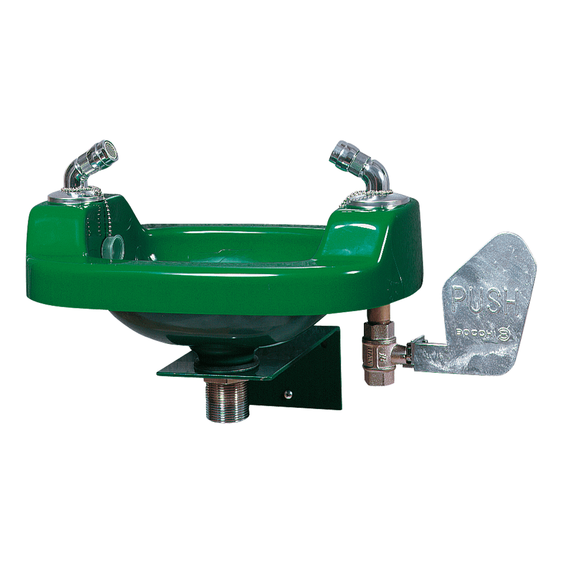Eyewash with aerated flow operated by manual side-push closure valve. ABS bowl. Wall mounted.