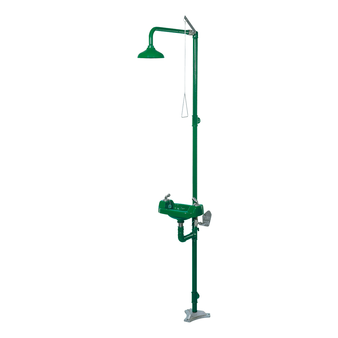 Combined emergency shower and eyewash station. Operated by a rigid pull handle; aerated flow eyewash operated by push knob or pedal.