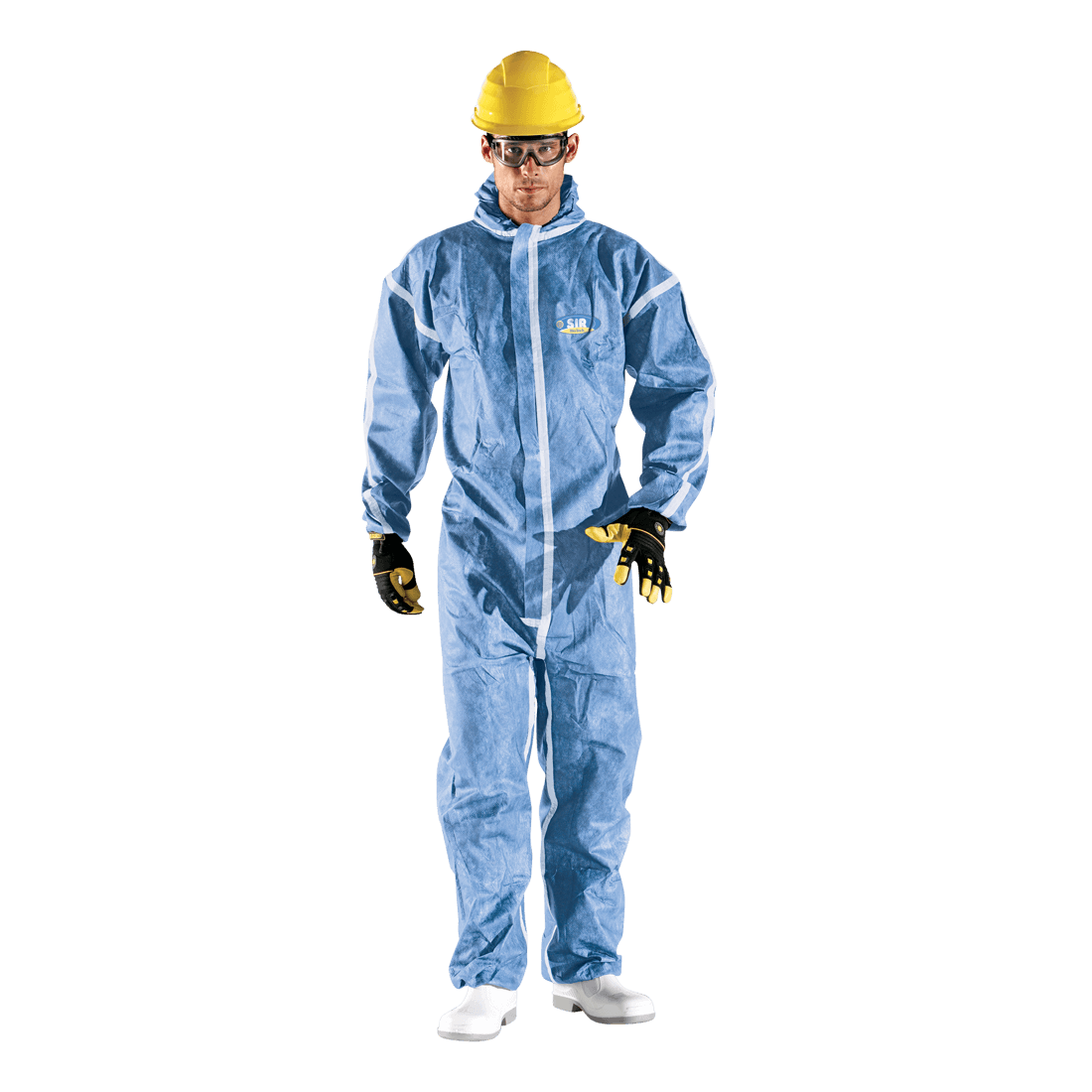 Coverall in microfibre fabric resistant to dusts, liquids and viruses, reinforced on both sides with a high density polypropylene layer to ensure high mechanical resistance; seams are resistant to liquids, mists and splashes, ultrasound sealed with contrasting colour. Specifically recommended for protection against active viruses, transmitted through blood or organic bodies, the coverall has a concealed zipper closure with adhesive flap and elastic hood, cuffs, waistband and ankles.