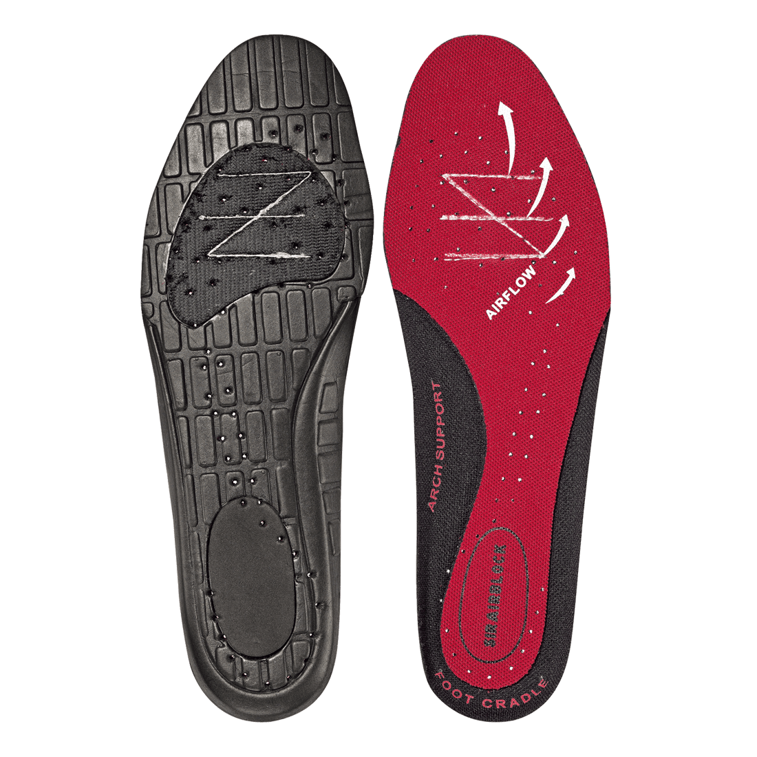 Insole with variable thickness, with cradled form heel side, arch support in the central area, plantar holes to allow air flow.