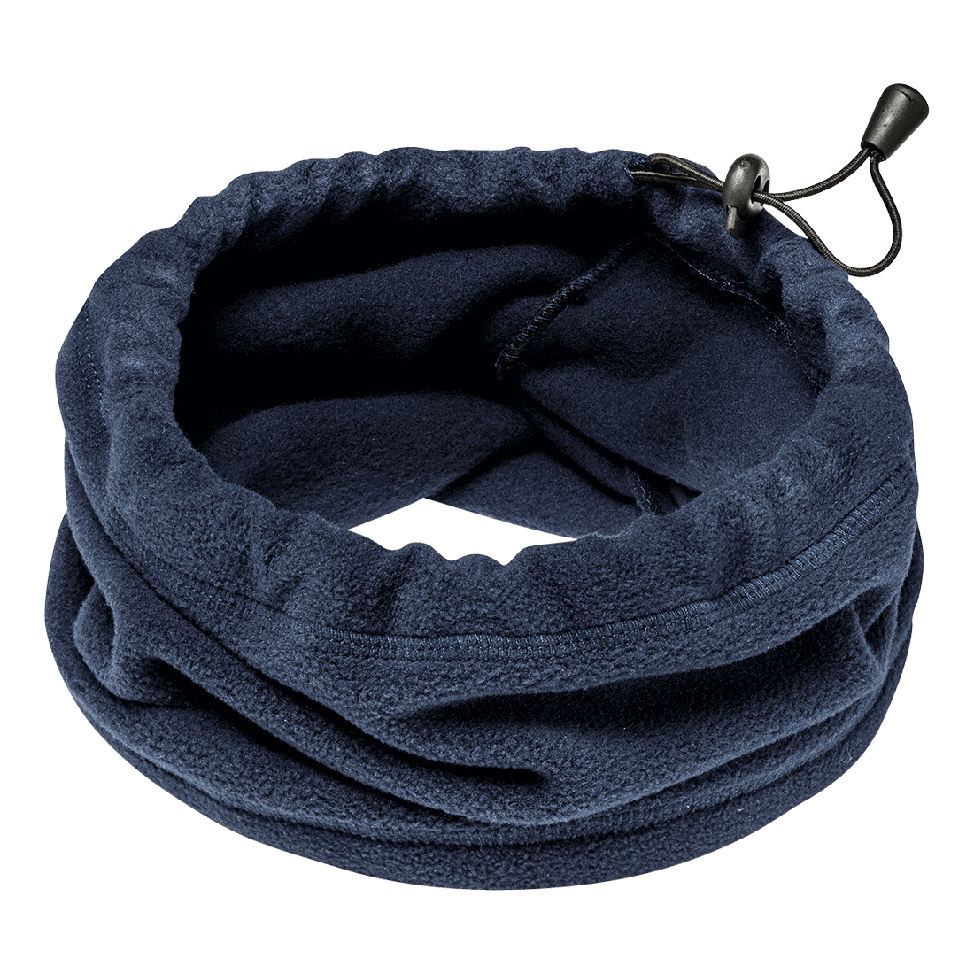 Neckwarmer in 100% polyester fleece, with adjustable elastic drawstring to convert it into a cap.