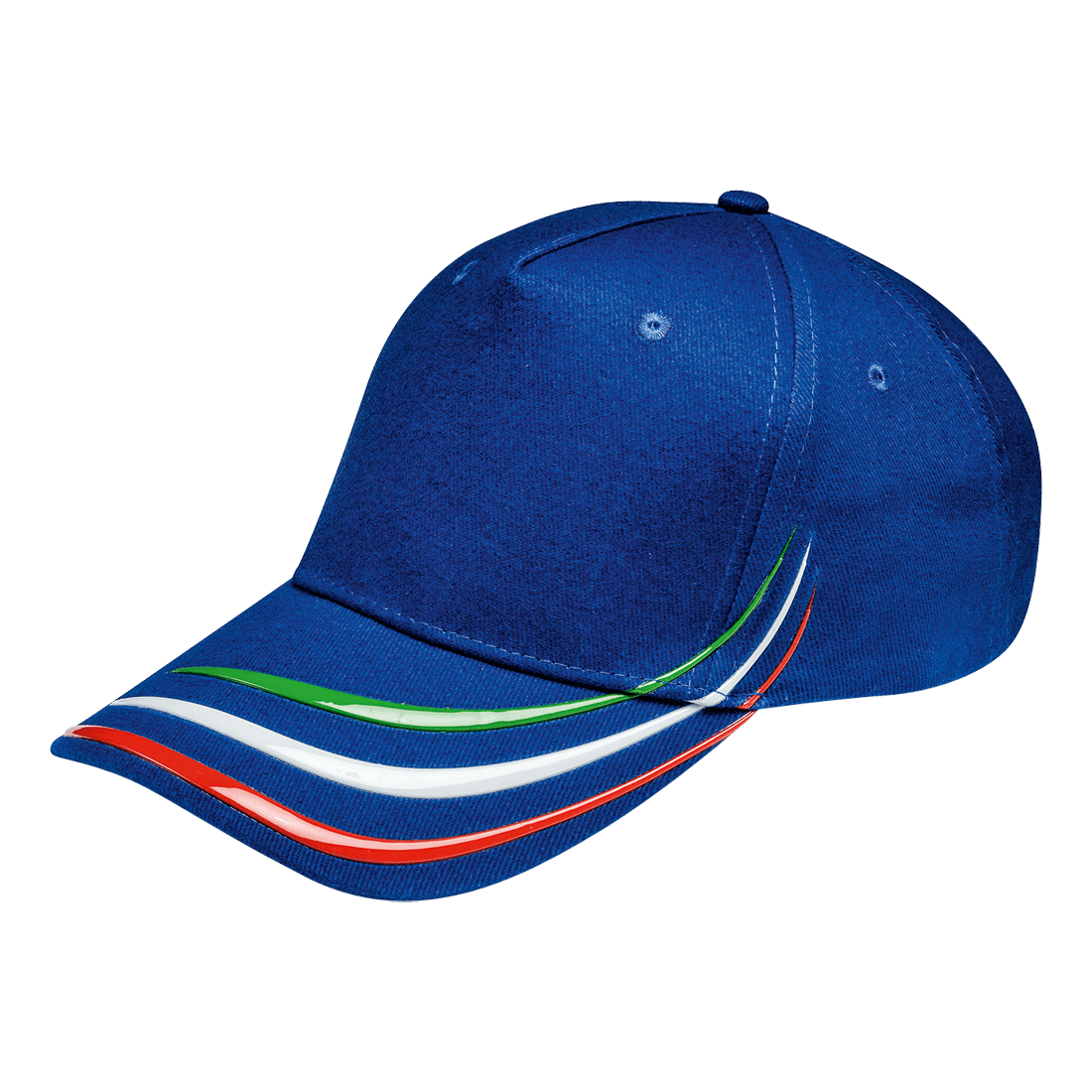 Baseball style cap in 100% cotton twill, with three-colour plastic inserts on the left of the peak. Width adjustable with Velcro.