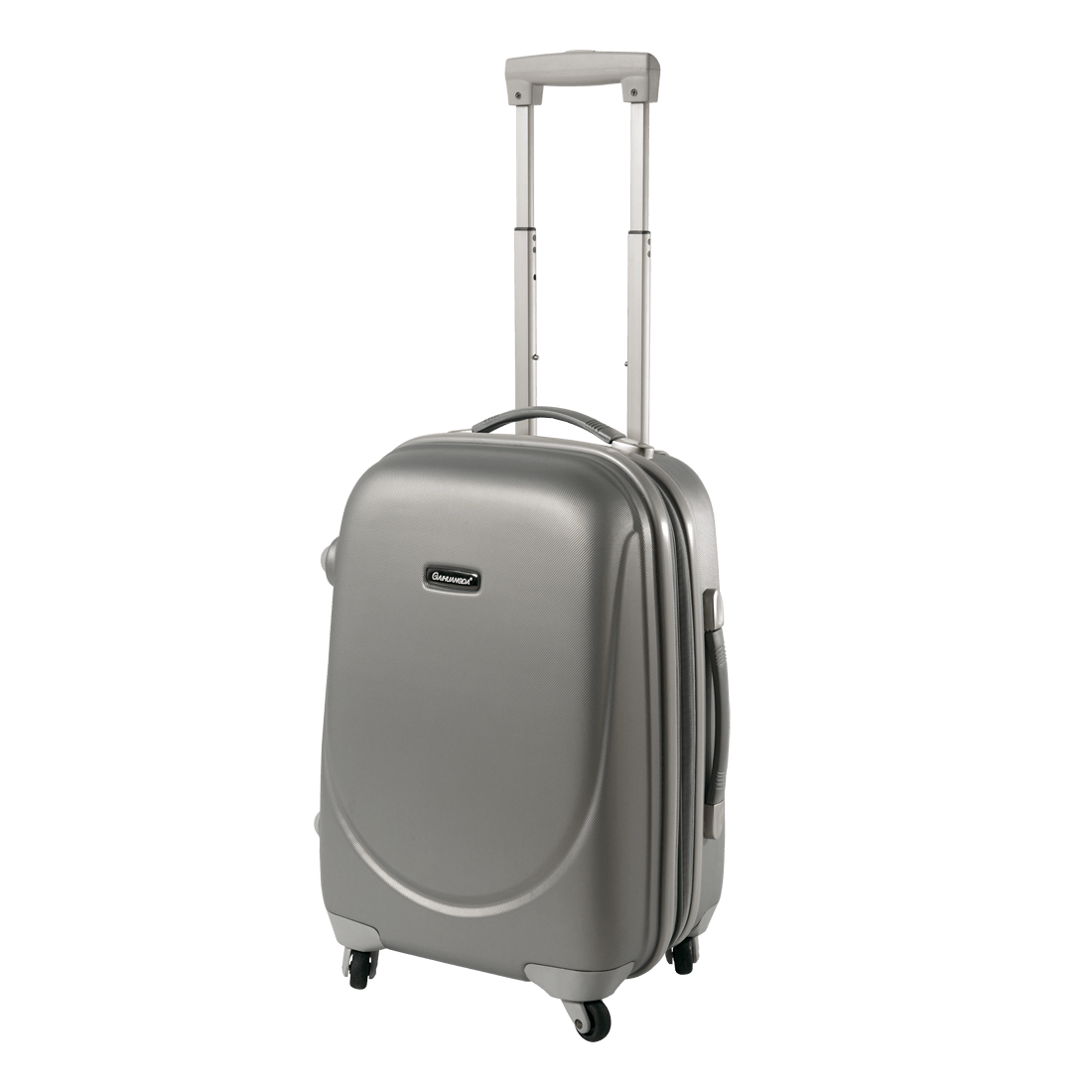 ABS hard shell suitcase, featuring telescopic trolley, 5 cm extendible width giving 35% more space. Four wheels with 360° rotation, two handles, inner compartments.
