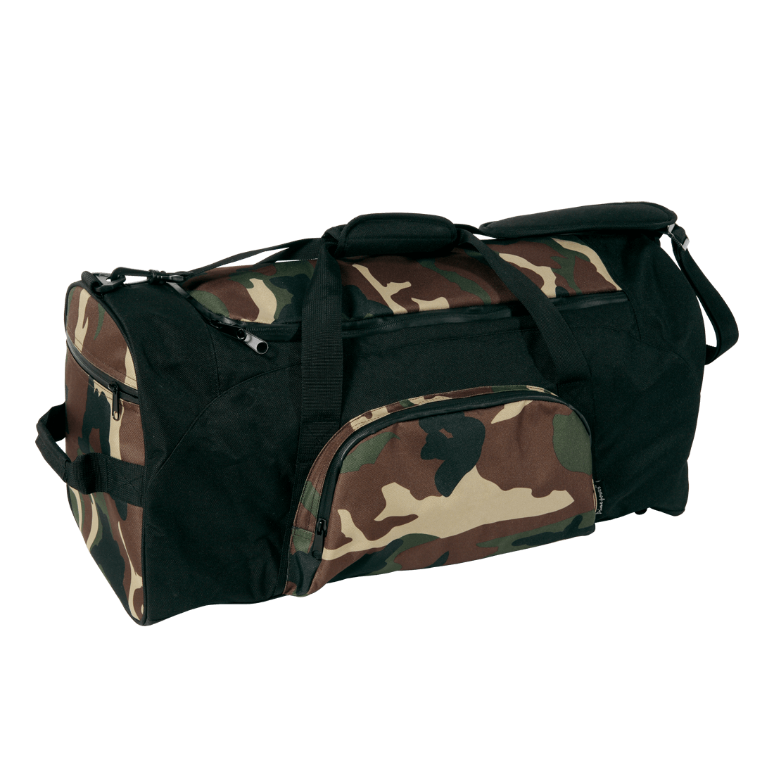 Bag in bicolour black/camouflage print fabric, three outer pockets with waterproof zipper closure, double handle and adjustable shoulder strap.