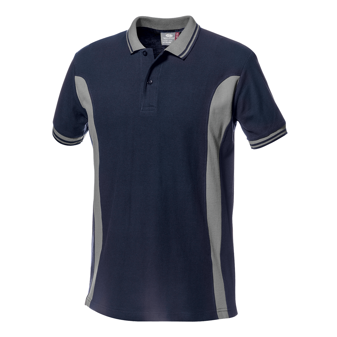 Polo Shirt made of 100% honeycomb cotton piquet, 210 g/m2 with silicon treatment preserving brightness of the colours and softness; short-sleeved with buttoned collar and seam puckering. Blue with grey inserts along the sides, collar and sleeves.