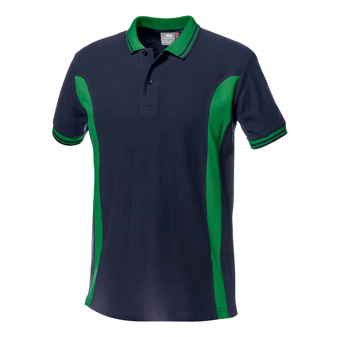 Polo Shirt made of 100% honeycomb cotton piquet, 210 g/m2 with silicon treatment preserving brightness of the colours and softness; short-sleeved with buttoned collar and seam puckering. Blue with green inserts along the sides, collar and sleeves.