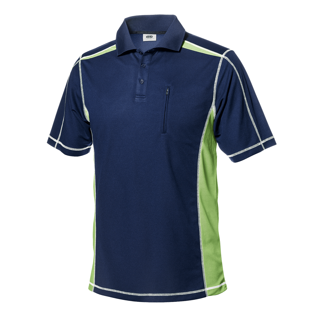 Polo shirt made of 100% jersey cotton, 140 g/m2, Blue with green inserts, buttoned collar, chest pocket with zip and chain stitched seam in contrasting colour.