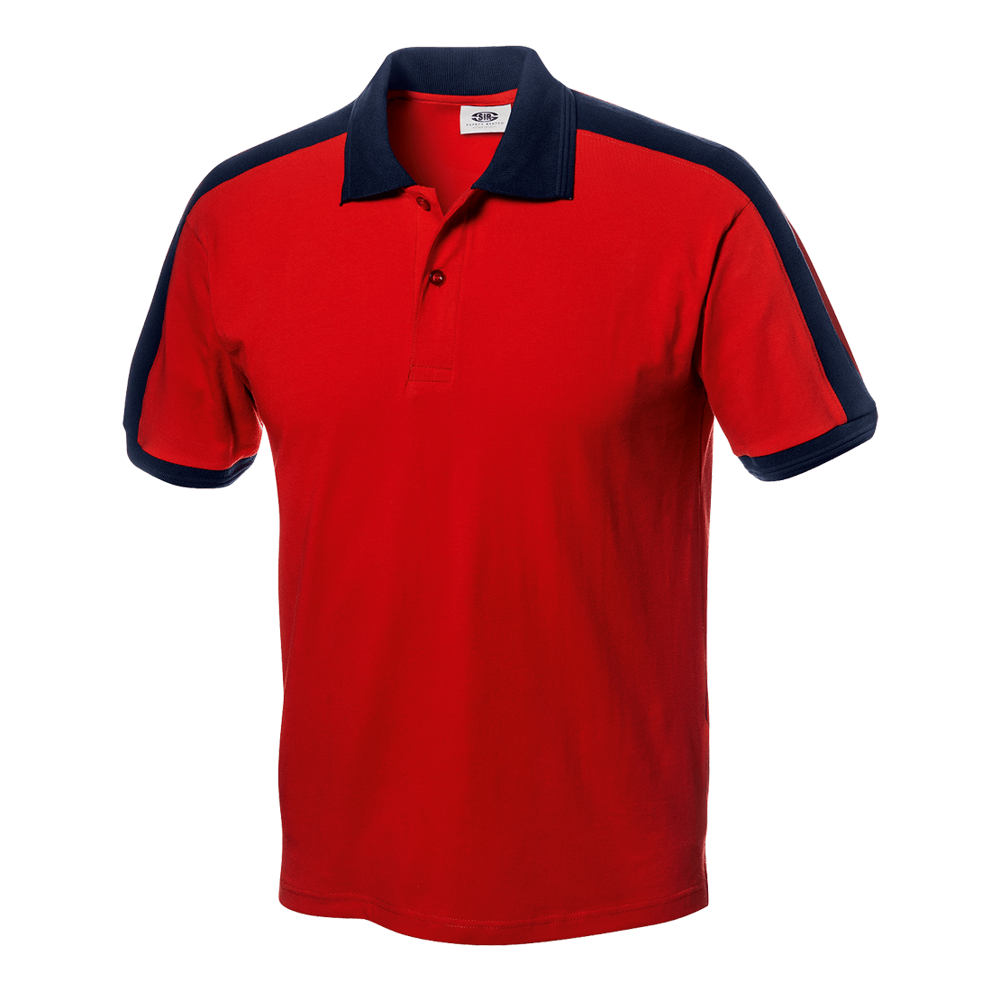 Polo shirt, made of 97% combed cotton jersey and 3% spandex, weight 200 g/m2, with a stretch effect. Red with elastic knitted collar, shoulder inserts and sleeves in Blue.