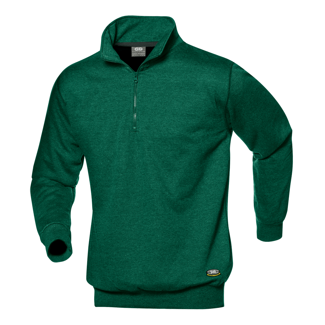 Sweatshirt made of 50% cotton-50% polyester, 280 g/m2, collar with zipper closure and trimming on inner seams, elastic knitted cuffs and waistband. Chain stitched seams in contrasting colour.