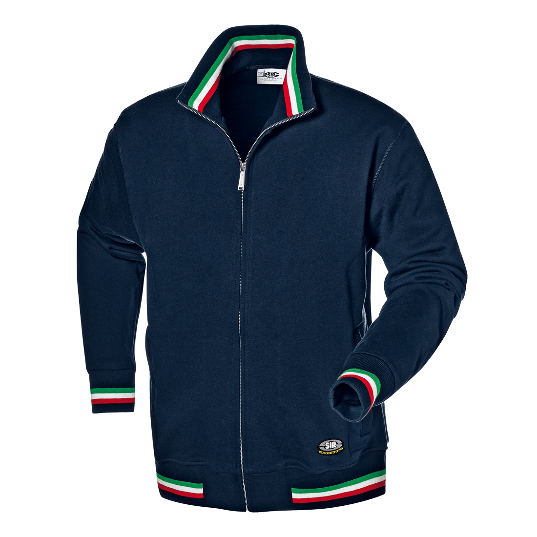 Sweatshirt made of 100% cotton, 400 g/m2, full-length metal zip, muff pockets with zipper closure, Italian flag finishing on cuffs, waistband and inner part of the collar.