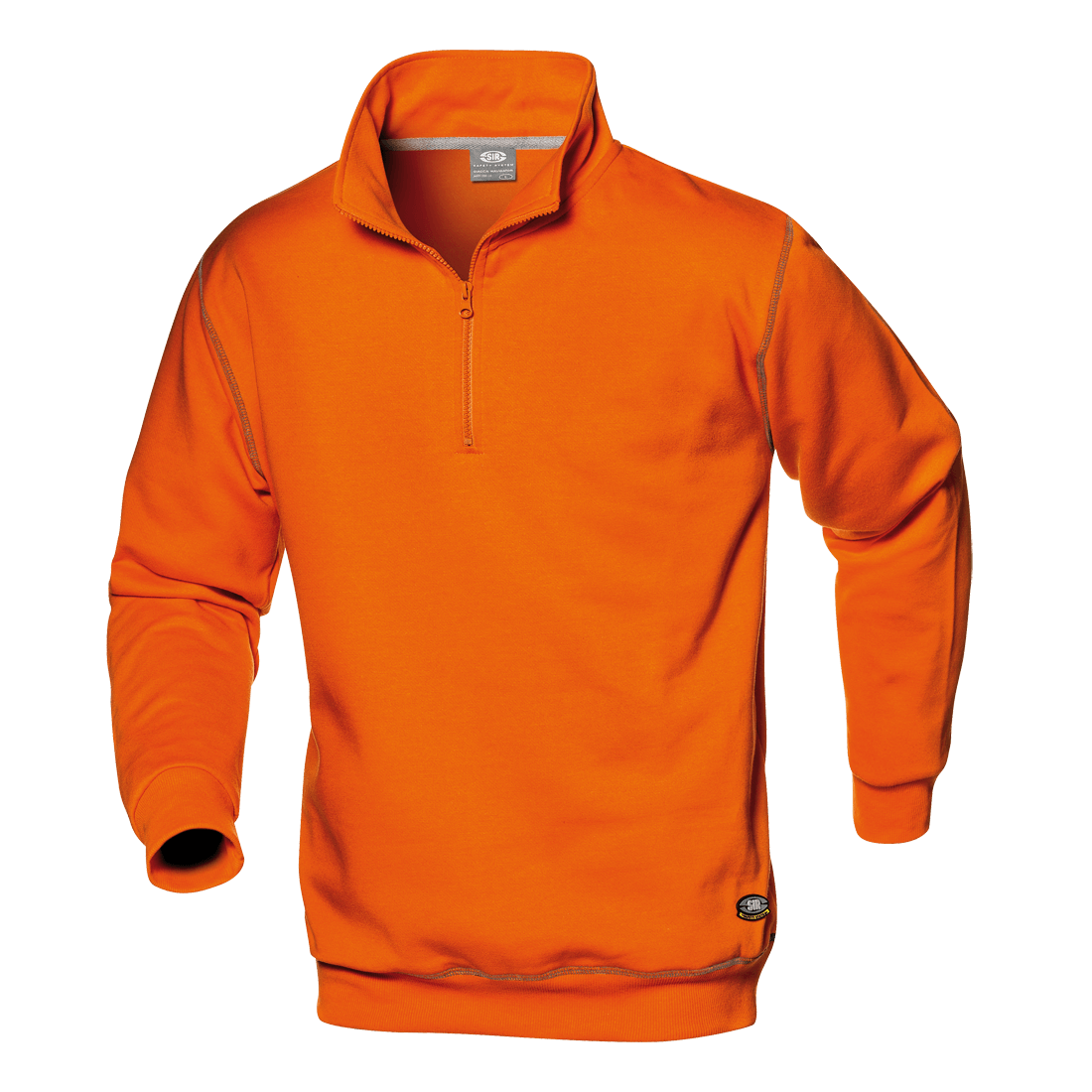 Sweatshirt made of 50% cotton-50% polyester, 280 g/m2, collar with zipper closure and trimming on inner seams, elastic knitted cuffs and waistband. Chain stitched seams in contrasting colour.