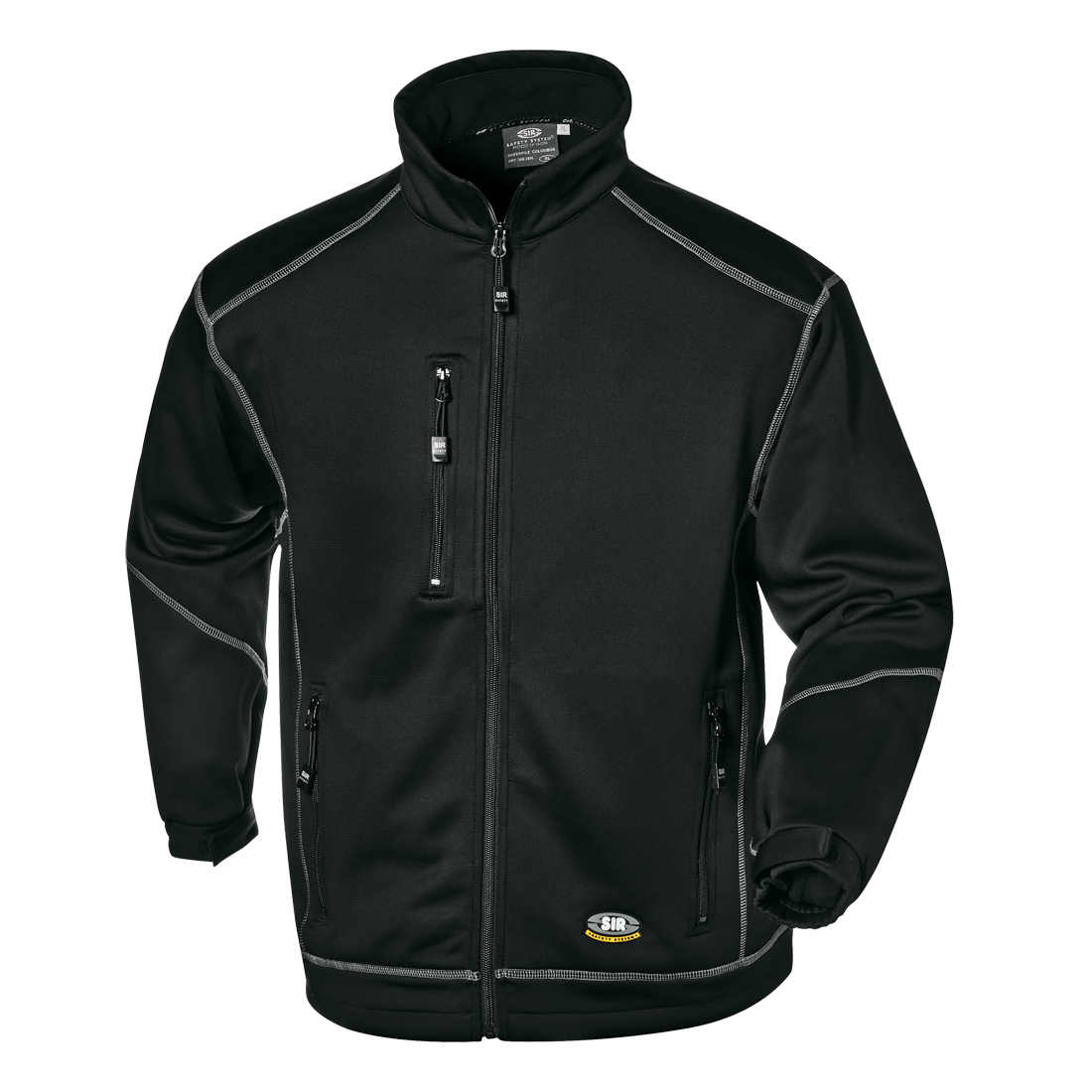 Technical fabric, polyester and micro-fleece paired fabric, 320 g/m2, full-length zipper closure, Velcro-adjustable cuffs, chest pocket and muff pockets with zip, waistband drawstring, internal pockets with contrasting stitched seams.