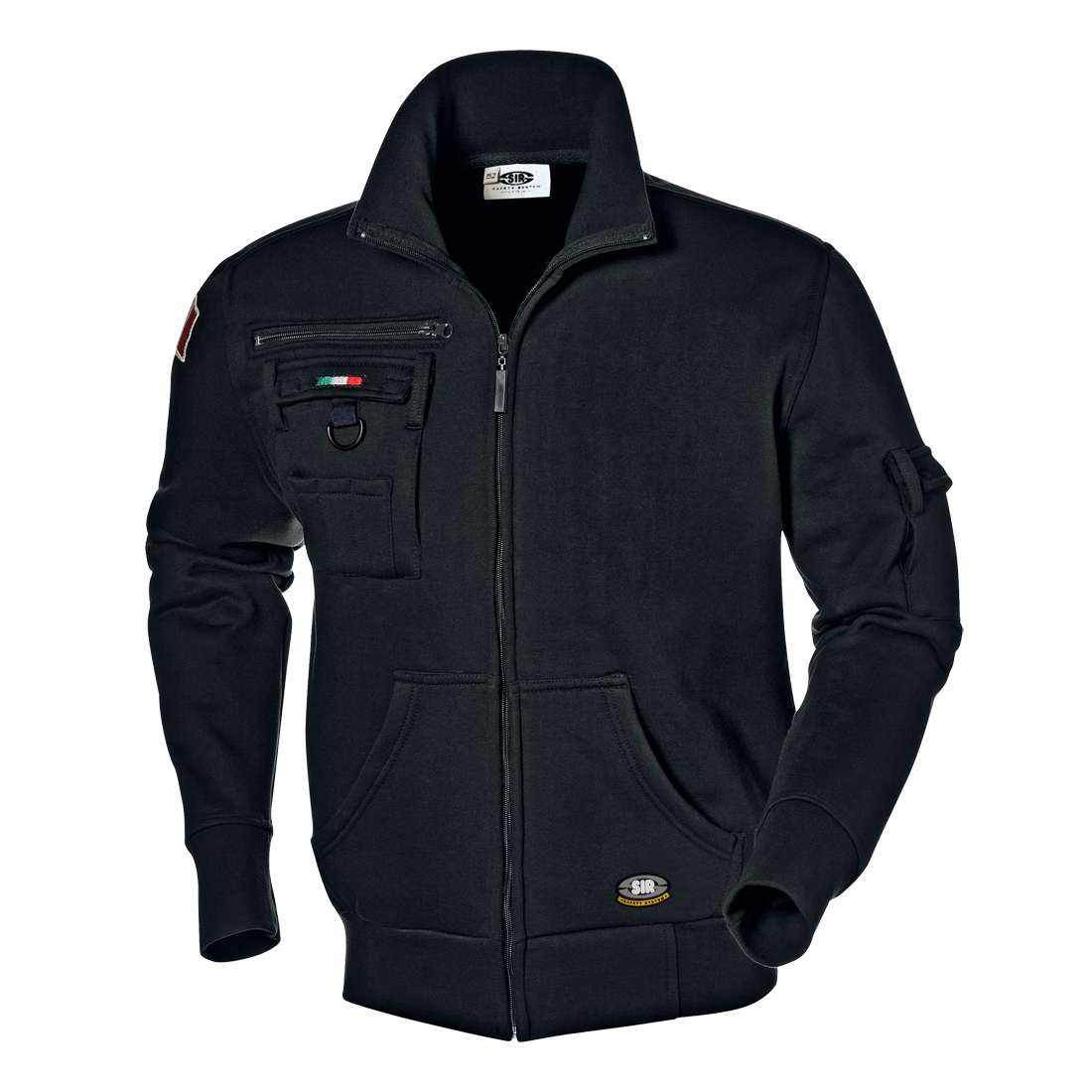 Sweatshirt in 50% polyester-50% cotton, 370 g/m2, elastic knitted cuffs and waistband heavier fabric (400 g/m2), muff pockets with reinforced runners, pocket with flap and Velcro on the left arm, chest pocket with Velcro and Italian flag decoration on flap, D-ring and pen holder, Italian flag on right sleeve.