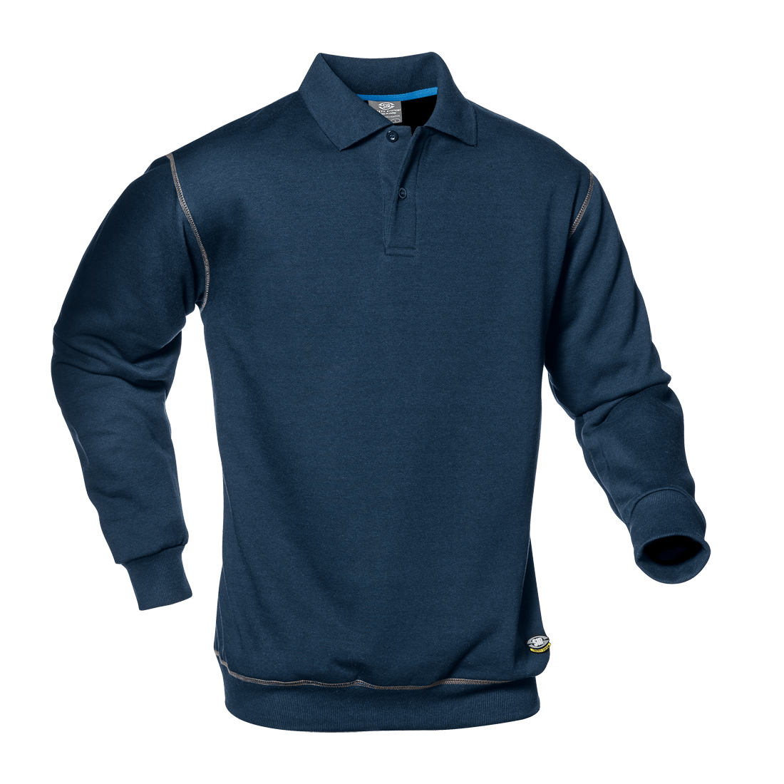 Sweatshirt made of 50% cotton-50% polyester, 280 g/m2, polo shirt, buttoned collar with trimming on inner seams, elastic knitted cuffs and waistband. Contrasting chain stitched seam.