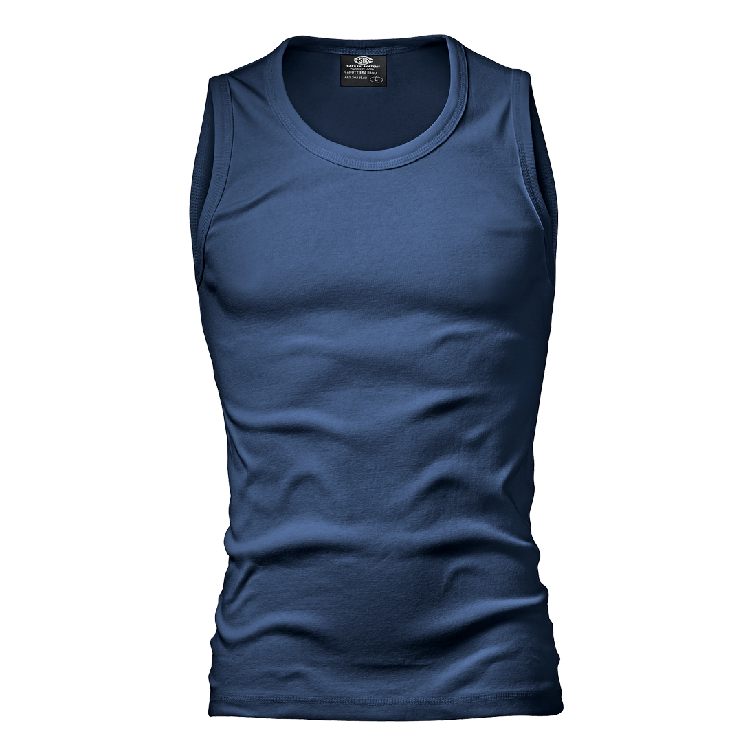 Undershirt made of 100% cotton, 220 g/m2, stretch effect, wide shoulder strap, double reinforcement stitched seams and elastic knitted collar.