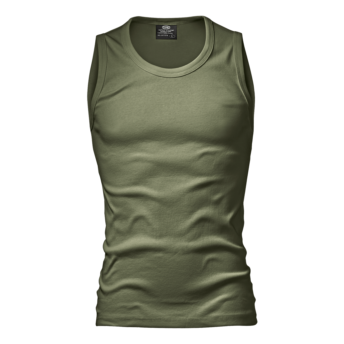 Undershirt made of 100% cotton, 220 g/m2, stretch effect, wide shoulder strap, double reinforcement stitched seams and elastic knitted collar.