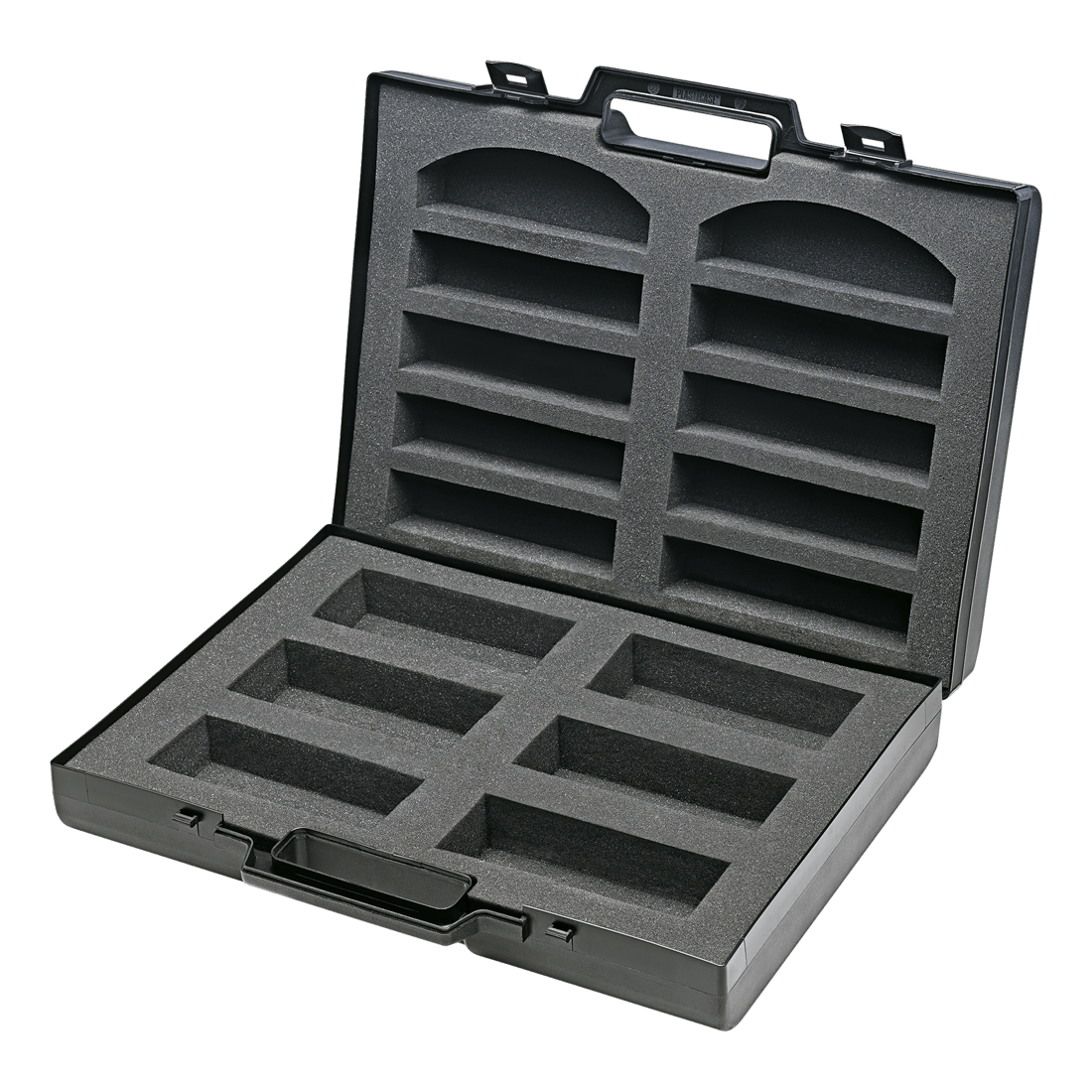 Glasses carrying case in polypropylene with inner compartments in die-cut sponge.