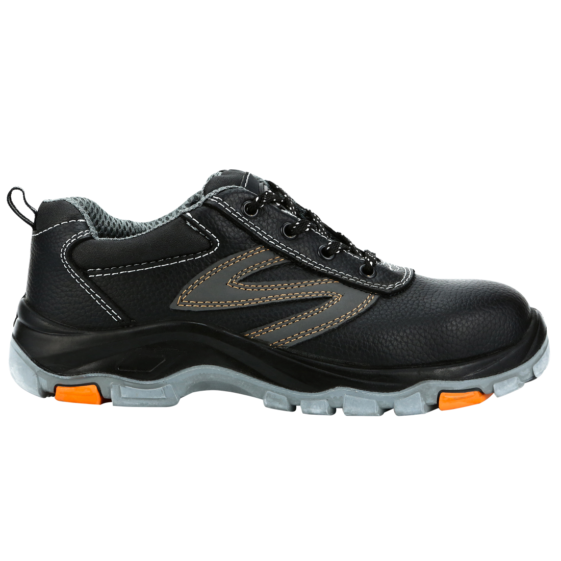 低幫安全鞋鋼包頭耐壓可達200Joule的沖擊,金屬材料防刺穿中底,全粒面牛皮鞋面,橡膠大底具有更好的防化性能。