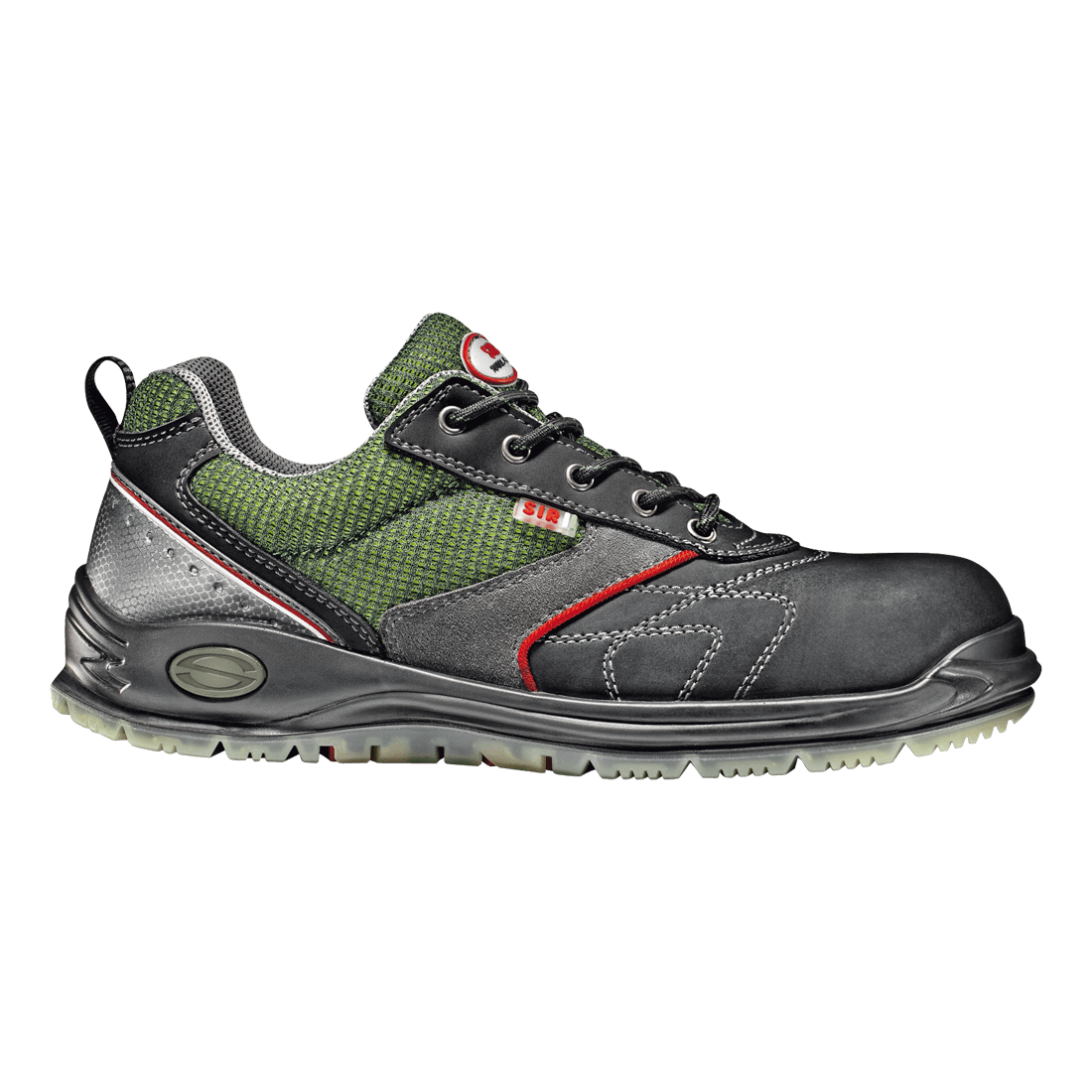 低幫安全鞋復合材料包頭耐壓可達200Joule的沖擊,零穿刺復合材料中底。磨面牛皮和透氣網布鑲拼鞋面。