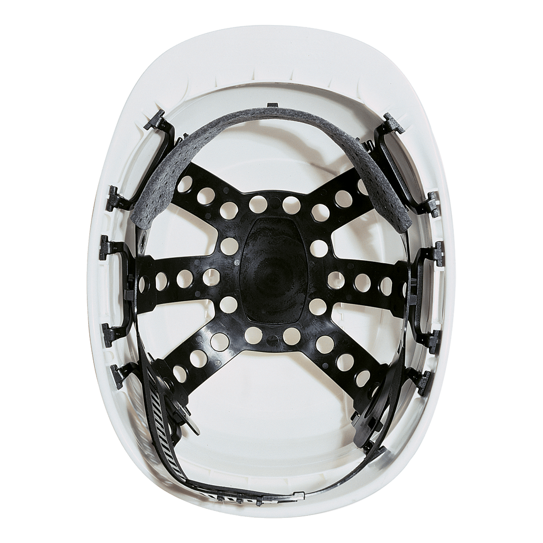 Polyethylene helmet with a 6-point polyethylene head harness. It features twelve ventilation holes, more rigid and stronger faceted surface, scratch-proof shell finish and replaceable front sweatband. Slots for earmuffs, chinstrap attachment and flat front for logo personalization. Resistant down to -30°C.