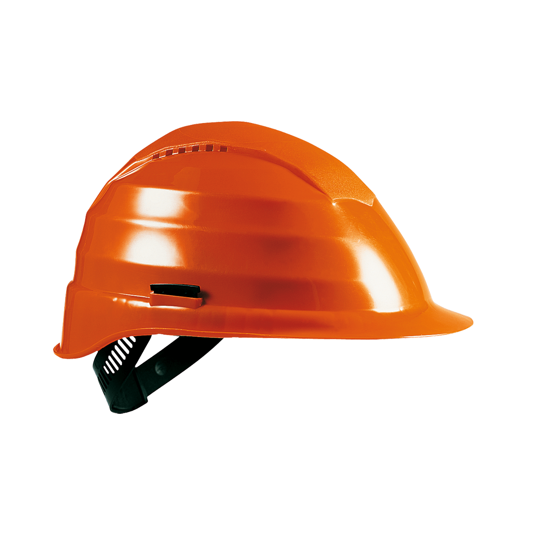 Polyethylene helmet with a 6-point polyethylene head harness. It features twelve ventilation holes, more rigid and stronger faceted surface, scratch-proof shell finish and replaceable front sweatband. Slots for earmuffs, chinstrap attachment and flat front for logo personalization. Resistant down to -30°C.